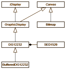 Konkreter wird es bei DG12232, das die Fähigkeiten eines GraphicDisplays beinhaltet, aber spezifische Eigenschaften des DG12232-Displays hat (z.B. die feste Größe von 122 x 32). Eine solche Klasse besitzt zwei Elemente vom Typ SED1520. Die SED1520-Klasse implementiert den Großteil des Treiber-Know-Hows. Die Arbeitsteilung sieht vor, dass DG12232 die Befehle entgegen nimmt und dann anhand der Pixel-Koordinaten auf die entsprechende Instanz von SED1520 abbildet. Die SED1520-Instanzen wiederum kennen nur "ihren" Controller und wissen nichts von ihrer Umgebung.
