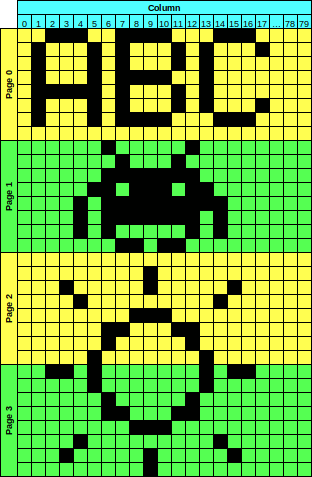 Der SED1520-Controller ist intern in 4 Seiten mit je 80 Spalten organisiert. Von diesen 80 Spalten sind bei diesem Display jedoch nur 61 angeschlossen. Jede Spalten/Seiten-Kombination adressiert 1 Byte, dessen 8 Bits die Farbe der 8 Pixel steuern. Um den Buchstaben "A" im nebenstehenden Bild zu erzeugen müssen also die Spalten 1 bis 5 der Seite 0 mit dem Bitmuster 0x7E, 0x11, 0x11, 0x11, 0x7E beschrieben werden. Das Beschreiben aufeinander folgender Spalten ist besonders effizient, weil der SED1520 seinen Schreibzeiger mit jedem Schreibzugriff automatisch um eins inkrementiert, d.h. die Schreibzugriffe können direkt aufeinander folgen, ohne dass zwischendrin eine neue Adresse gesetzt werden müsste.