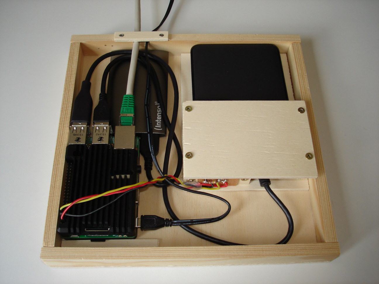 externen Festplatten in eine oben offene Box gepackt, die ich aus Sperrholz und Modellbauleisten gebaut habe.