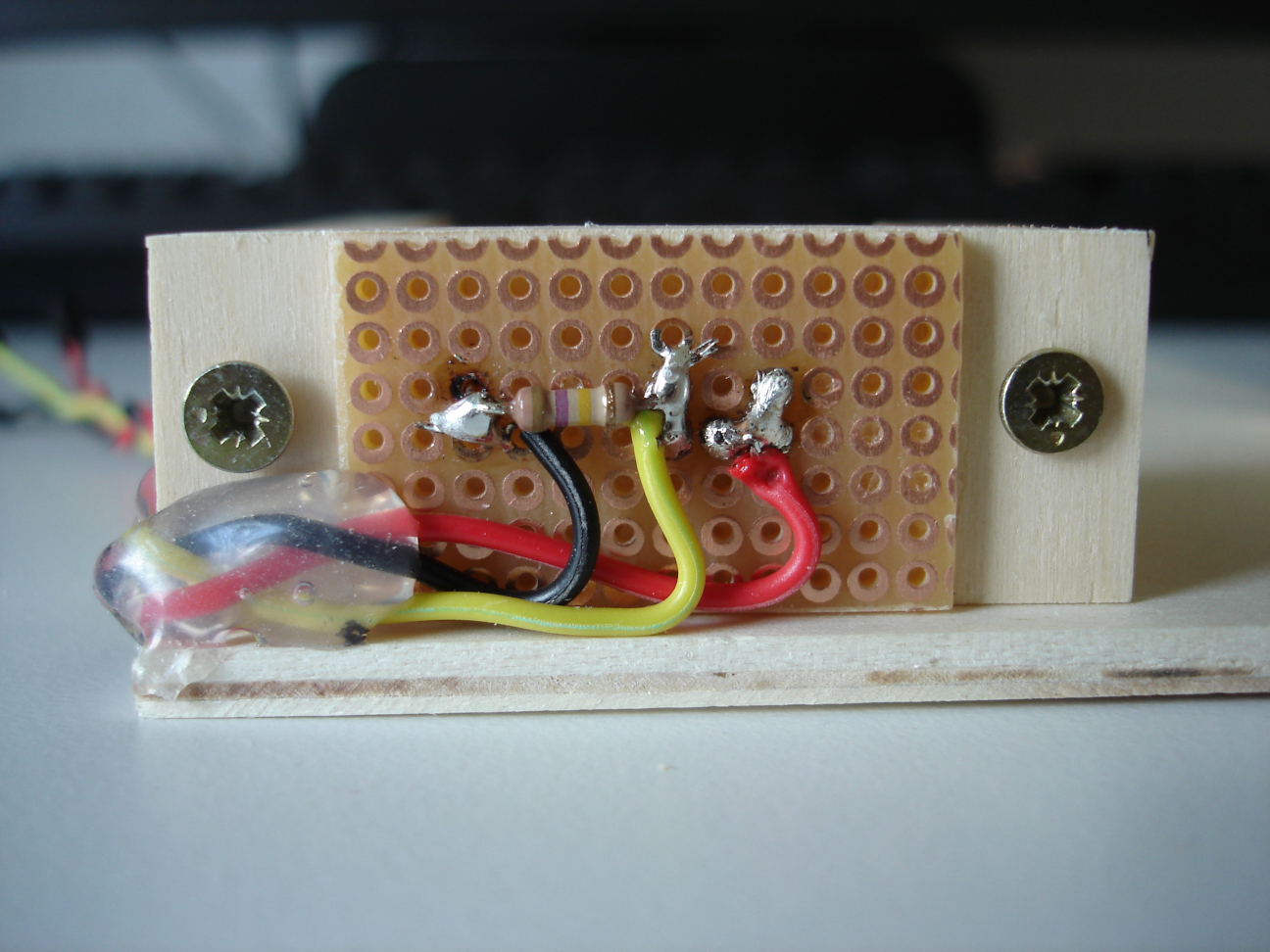 gestaltet, indem ich die Bauteile auf ein Stück Punktraster-Platine gelötet habe. Das Ganze steht
