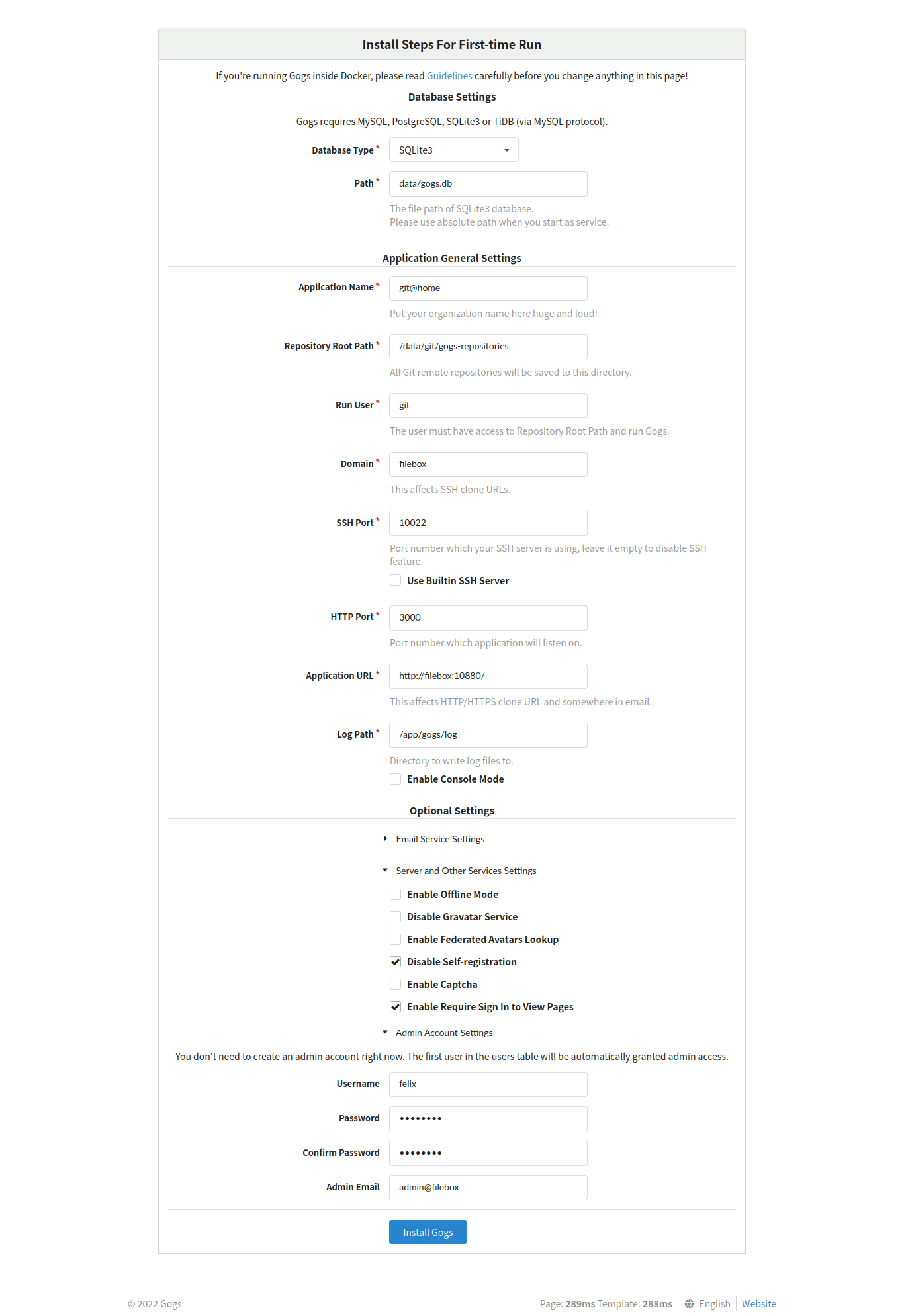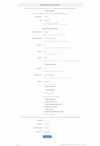 Repositories nutzen werde). Ein Klick auf den Button "Install Gogs" validiert zunächst die Eingaben