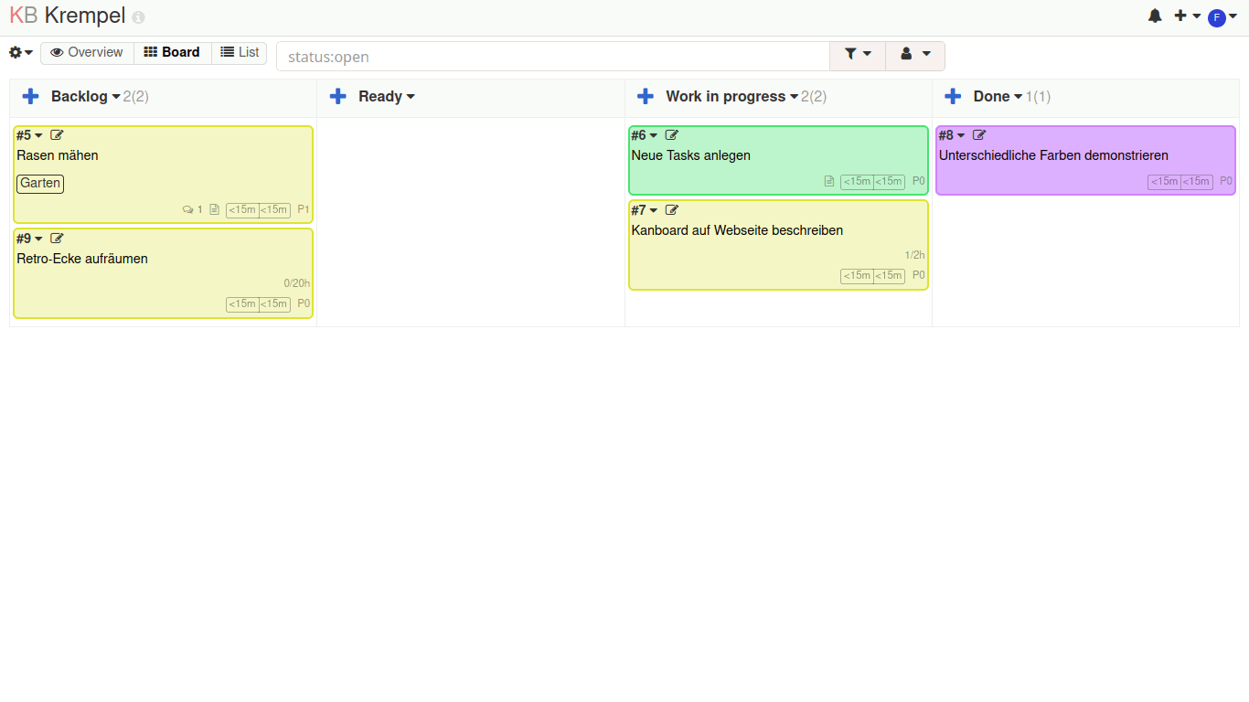 Für meinen Anwendungsfall ist Kanboard hoffnungslos überdimensioniert. Das wäre normalerweise kein Problem, wenn man einfach ein paar der Features nicht nutzen würde, aber sie belegen Platz in der Oberfläche und fallen somit ständig in den Fokus, was mich gestört hat. Für meine Software-Projekte werde ich wahrscheinlich mit dem Ticket-System in Gogs auskommen und für die TODO-Liste habe ich noch einen Blick auf myTinyTodo geworfen.