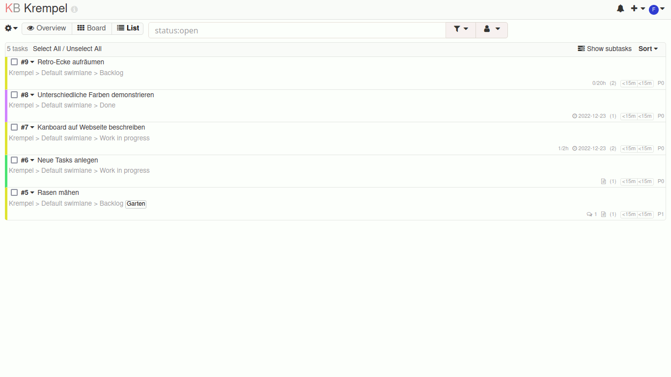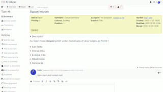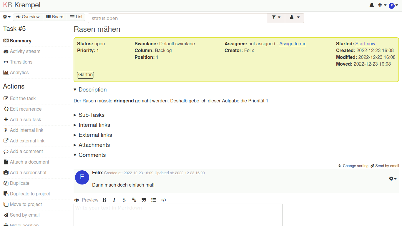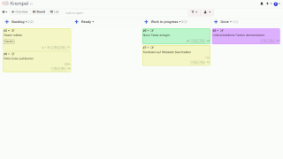 Für die Verwaltung von TODOs hatte ich mir Kanboard angesehen. Kanboard ist ein ausgewachsenes Programm zur Projektverwaltung und kommt dementsprechend mit einer Vielzahl an Funktionen zur Planung und Verfolgung von Aufgaben daher: Subtasks, Termine, Prioritäten, Statistiken, Verweildauer in Spalten, verschiedene Rollen, Zeiterfassung, Activity Streams, Anhänge, Kommentare und Verlinkungen, ...
