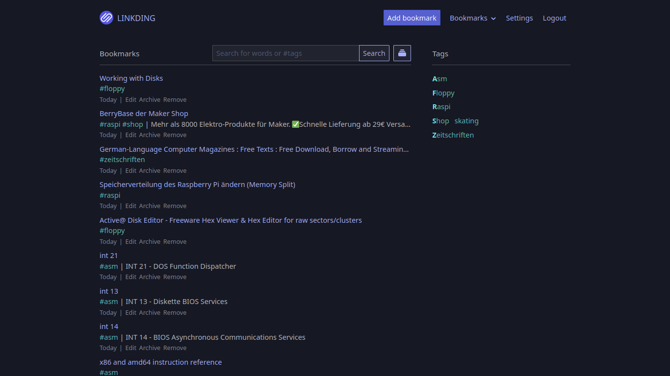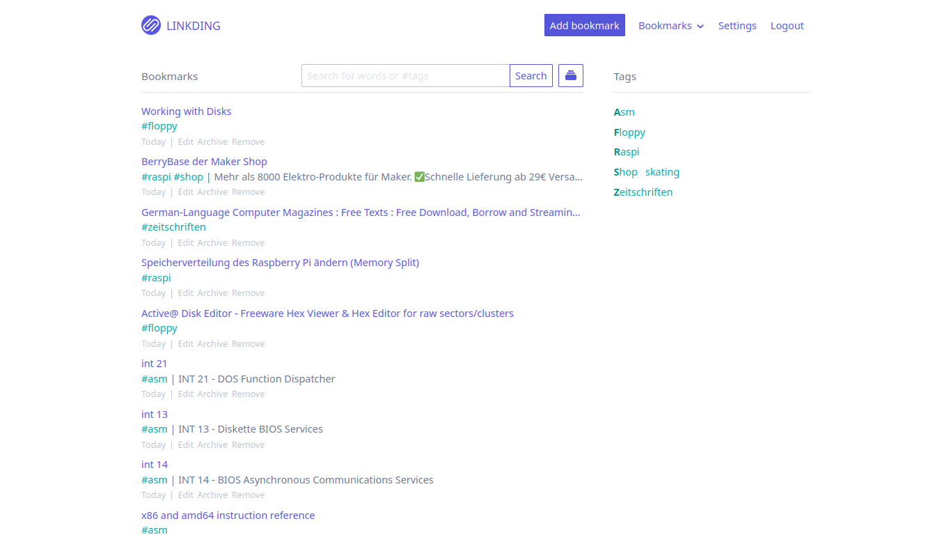 Update: tatsächlich habe ich festgestellt, dass ich Linkding im Alltag kaum benutze. Zum einen ist der Stern-Button im Browser doch einfacher und schneller, zum anderen sind viele Bookmarks eher kurzlebig; um eine Stelle im Web wiederzufinden. Meistens merke ich mir auch lieber, wie ich etwas gefunden habe (also die passenden Schlagworte zum Suchen), anstatt wo ich es gefunden habe. Außerdem belegt Linkding auch im Leerlauf rund 120 MB Arbeitsspeicher, was mir für einen kaum genutzten Dienst zu viel war.