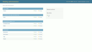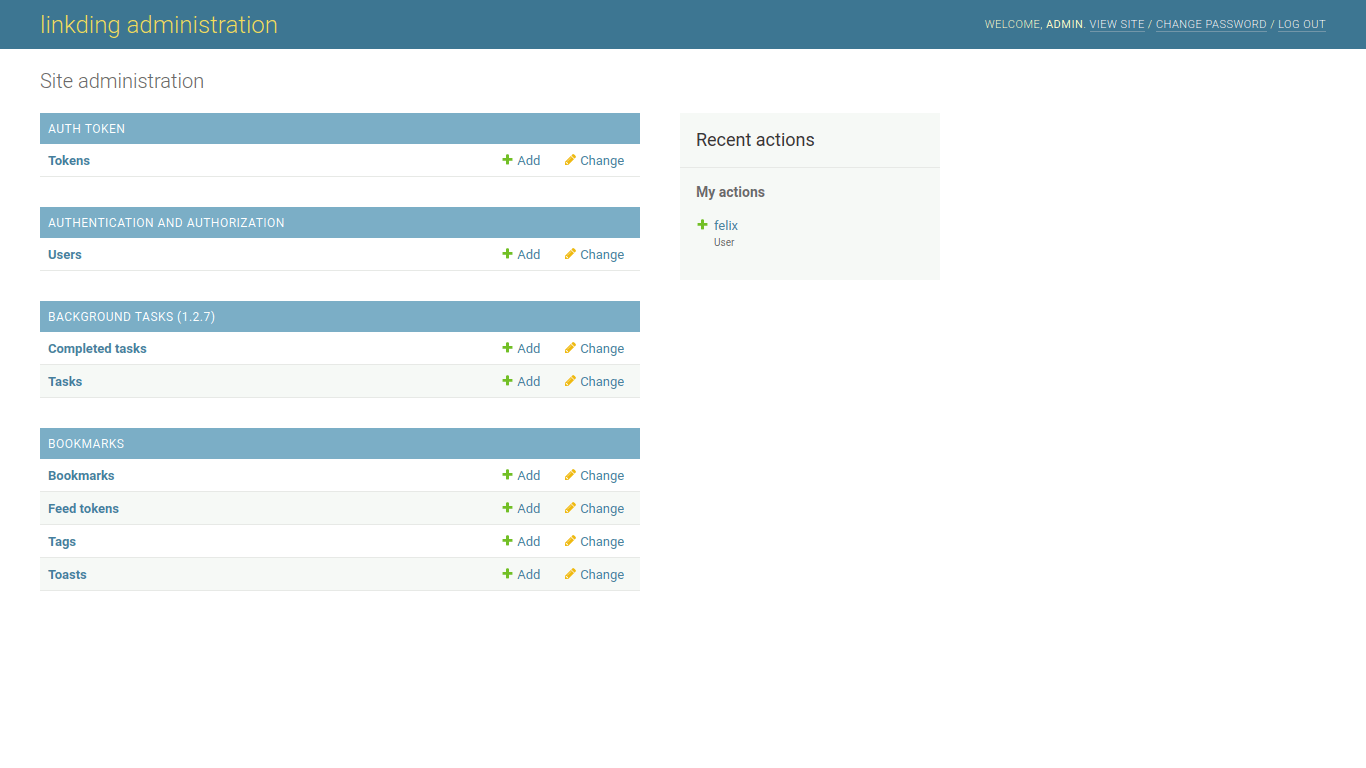 Nach dem ersten Login sollte bei obigem Setup das Admin-Passwort geändert und ein normaler Benutzer angelegt werden. Dazu dient unter "Settings" das Tab "Admin", das als neue Seite aufgeht. Dem neuen Benutzer kann ebenfalls der Superuser-Status gegeben werden, oder auch feiner aufgeteilte Fähigkeiten.