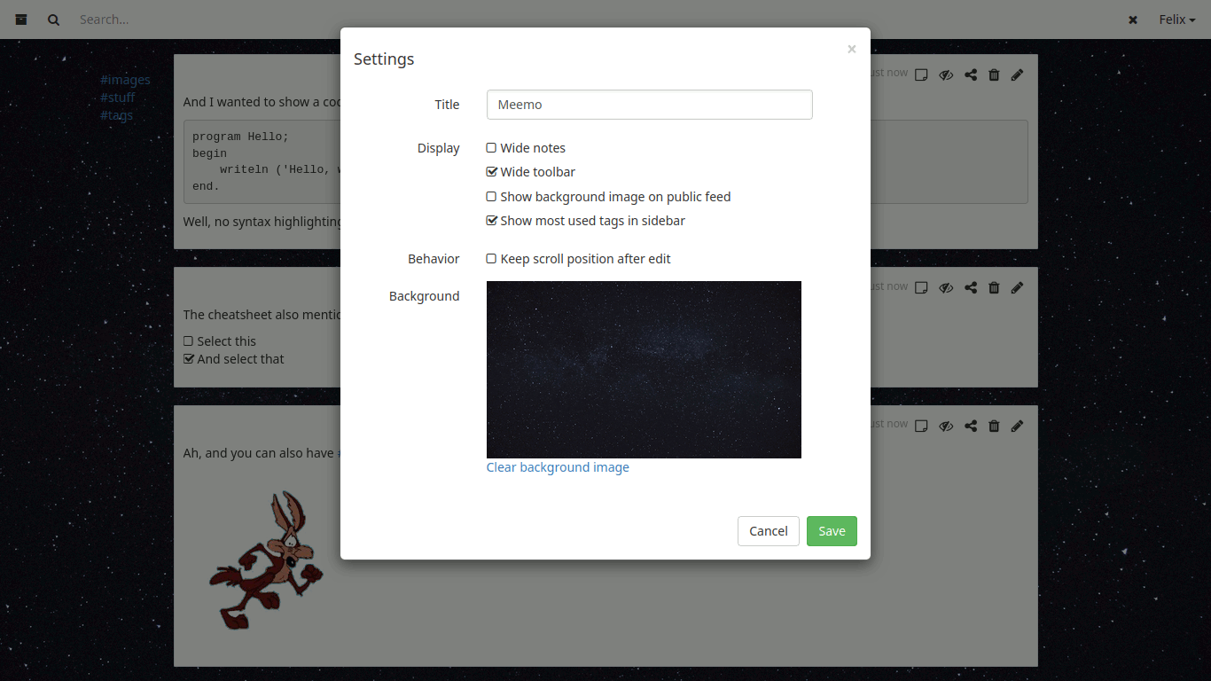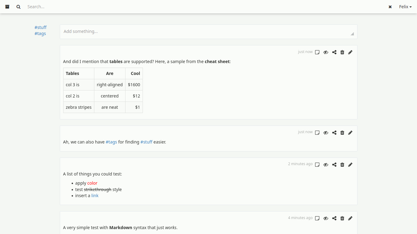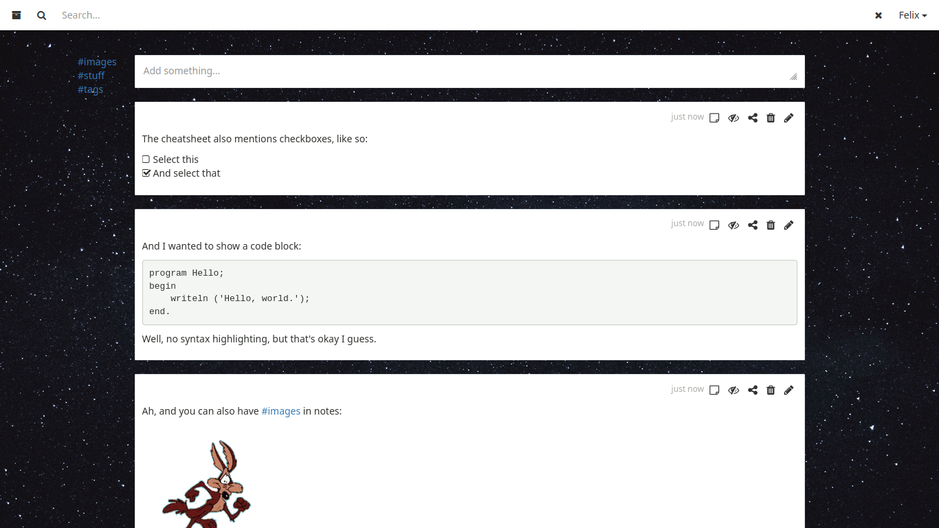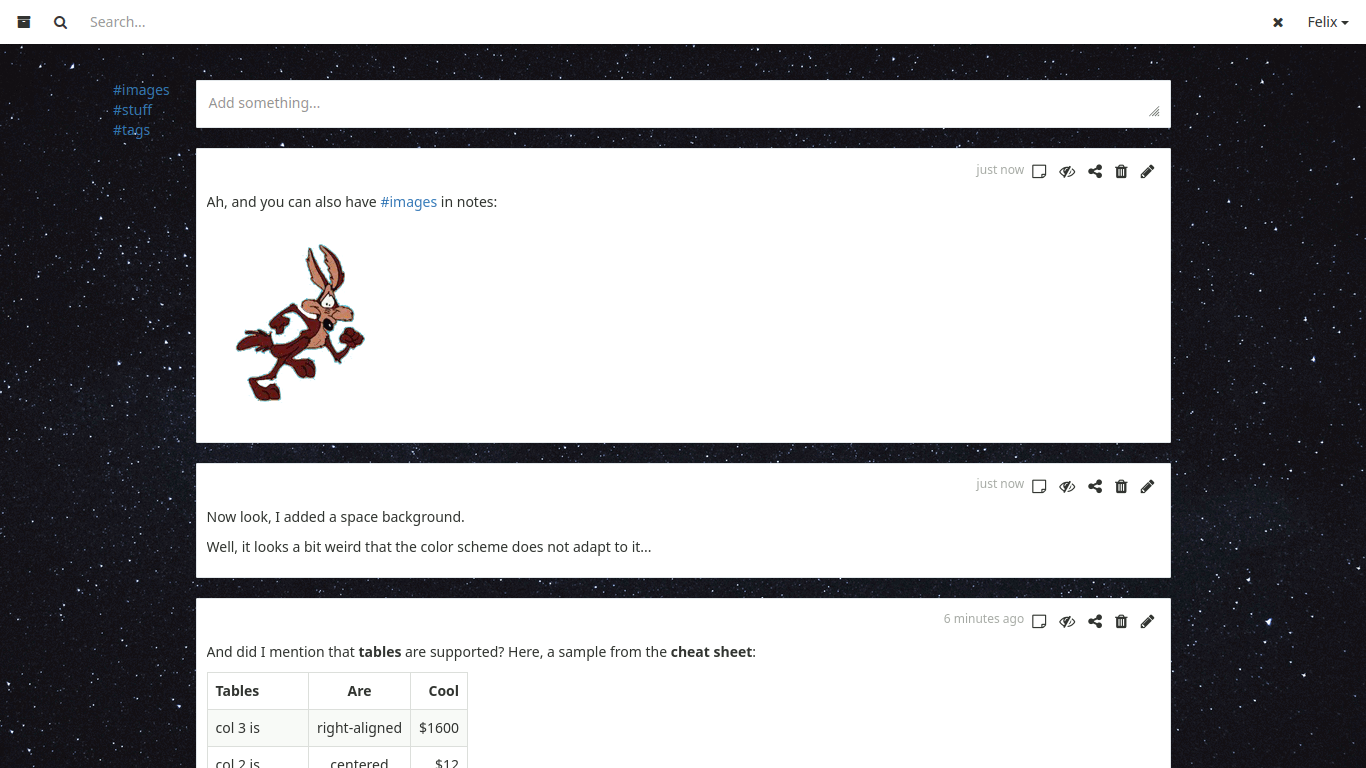 Als zweite Anwendung zur Notizverwaltung habe ich mir Meemo angesehen. Was mir daran gleich gefallen hat ist die Übersichtlichkeit: eine Suchzeile, ein langer Feed aus Nachrichten, auf Wunsch eine Liste der häufigsten Tags am Rand und ein Eingabefeld für eine neue Notiz; das war's. Optional kann noch ein Hintergrundbild ausgewählt werden. Aber der Fokus liegt ganz klar auf den Notizen und der Art und Weise wie man sie wiederfindet.