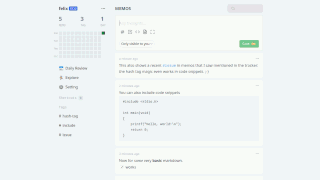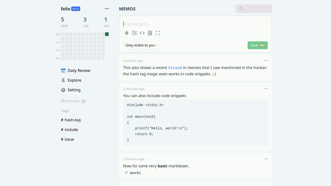 Zur Verwaltung von Notizen habe ich mir mehrere Anwendungen angesehen, unter anderem Memos. Memos ist von Haus aus auf den Betrieb als Docker-Container vorbereitet und speichert seine Daten in einer leichtgewichtigen SQLite-Datenbank. Dies wird auch in den Features prominent erwähnt, zusammen mit der Tatsache, dass es Open Source ist und man somit "für immer" kostenlos auf seine Notizen zugreifen kann. Das scheint momentan echt einen Nerv zu treffen. Zu den offensichtlichsten Funktionen und Elementen der Oberfläche gehören: