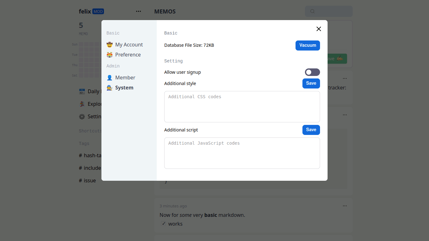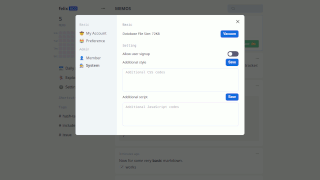 Nach dem ersten Start kann man auf der Login-Seite einen ersten Benutzer anlegen, der auch "Site Host" wird. Danach landet man direkt in der Hauptansicht/Dashboard und kann erste Notizen anlegen. Sehr viel mehr an Einrichtung ist nicht notwendig, jedoch kann eine optionale E-Mail-Adresse angegeben werden. Im Admin-Bereich können weitere Benutzerkonten angelegt, oder das selbständige Anlegen von Konten erlaubt werden.