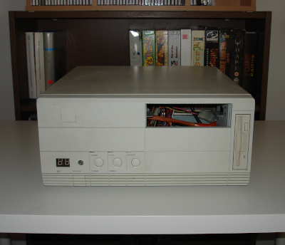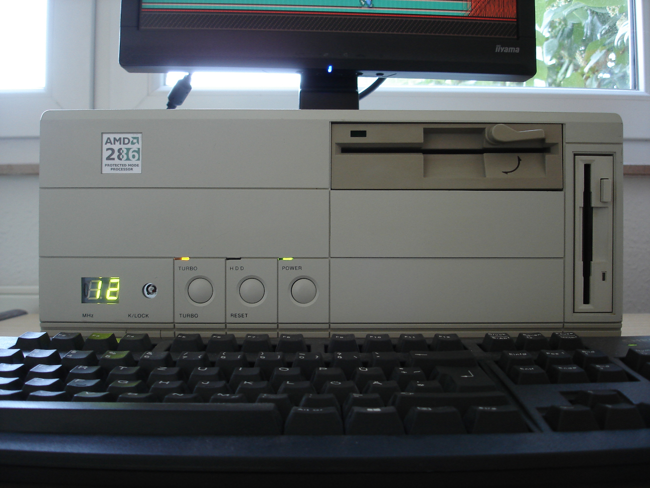 Bei diesem PC handelt es sich um einen eher späten 286er. Das erkennt man auch daran, dass das Mainboard bereits über integrierte Controller für Floppy-Laufwerke und Festplatten verfügt -- ein nettes Feature das man selbst auf so manchem 386er-Mainboard vergeblich sucht. Die beim Kauf vorhandene Grafikkarte besitzt sowohl einen 15-poligen VGA-Anschluss als auch einen 9-poligen Anschluss für MDA/CGA/EGA, was bestimmt ein gutes Verkaufsargument war: man kann einen bereits vorhandenen Monitor weiter verwenden, ist aber auch für die hoch auflösende Grafik der Zukunft gerüstet...
