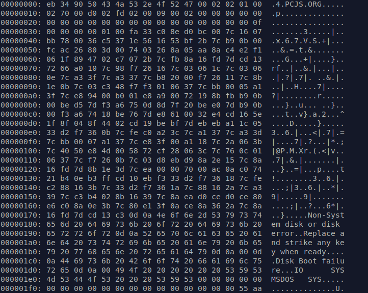 Der Anfang ist der Freitext mit Teilenummer und Copyright-Informationen, ab E05BH folgt der BIOS-Code der ausgeführt wird. Das kann nahezu beliebig kompliziert werden. Wir wollen als nächstes lieber einen Blick auf den Bootsektor einer MS-DOS-Diskette werfen. Praktischerweise kann man das Image auch gleich durch einen Klick auf "Save" von PCjs runterladen.