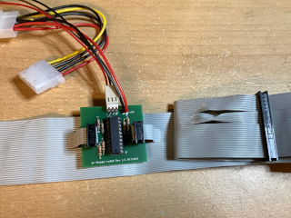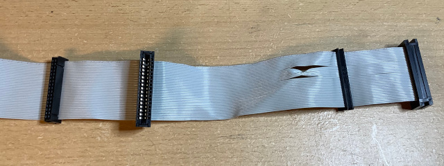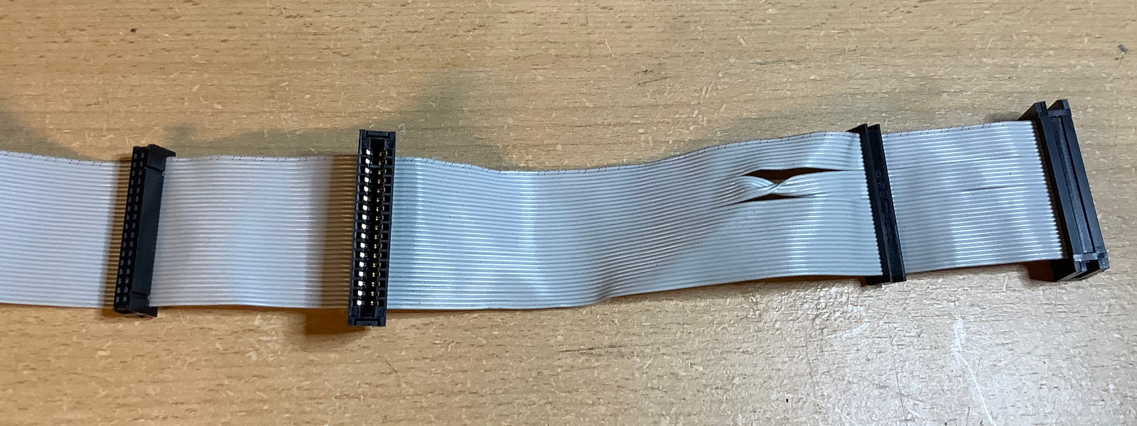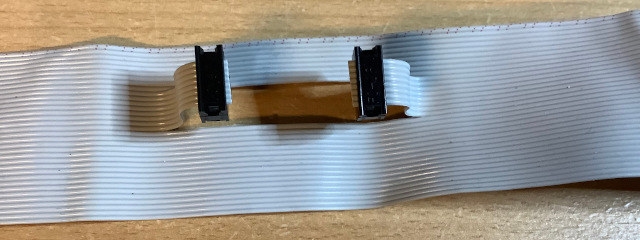 Womit wir bei der Hauptschwierigkeit angelangt wären: es wird ein spezielles Kabel benötigt, das es so nirgends fertig gibt. Zur Herstellung wird ein normales Floppy-Kabel benötigt, sowie zwei 8-polige Pfostenbuchsen (Reichelt-Artikelnummer "PFL 8"). Mit einem Messer trennt man nun die Leitungen 10 bis 17 aus dem Verbund der 34 Leitungen heraus. Achtung: das ist eine mehr als bei dem normalen Twist, der die Leitungen 10 bis 16 umfasst. Der Grund ist einfach: 7 Leitungen in eine 8-polige Pfostenbuchse einpassen ist fummelig und fehleranfällig; 8 Leitungen einpassen ist beinahe narrensicher. Da Leitung Nummer 17 sowieso nur GND trägt, fehlt sie auf der anderen Seite auch nicht.