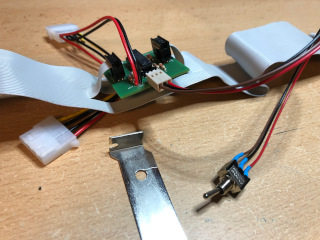 Ansonsten wird noch ein Anschluss für die Spannungsversorgung (+5 Volt) benötigt, sowie natürlich der Schalter, mit dem die Laufwerkreihenfolge umgeschaltet werden soll. Zur Spannungsversorgung bietet es sich an, ein Floppy-Stromkabel mit Molex-Stecker zu zerlegen. In meinem Fall habe ich ein Y-Kabel verwendet, d.h. die Schaltung hängt sich wie ein Parasit dazwischen und verbraucht selbst keinen Anschluss -- was gerade in alten PCs sehr nützlich ist, weil hier die Zahl der Stecker meist knapp bemessen ist (= immer einer weniger als man braucht).