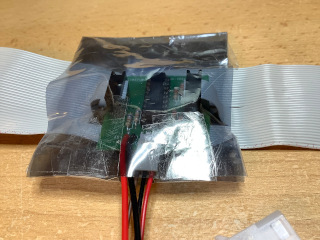 Die Anschlüsse für das Flachbandkabel waren ursprünglich als 8-polige Wannenstecker vorgesehen, also verpolungssicher dank der Aussparung für die entsprechende Nase an der Pfostenbuchse. Da ich aber im Schaltplan zum Pin-Header gegriffen hatte, wurden im Layout auch dessen Umrisse gezeigt... langer Rede kurzer Sinn: in Revision 1.2 der Leiterplatte habe ich die Widerstände so dicht an den Anschlüssen platziert, dass die Wannenstecker nicht mehr gepasst haben. Nach der Bestückung mit Pin-Headern hat mir das aber im Vergleich zur früheren Version mit Wannensteckern so viel besser gefallen, dass ich dabei geblieben bin. Jetzt muss man zwar beim Aufsetzen der Pfostenbuchse aufpassen, aber wenn man das Kabel richtig gebaut hat, dann kann das Anschließen gar nicht mehr schief gehen.