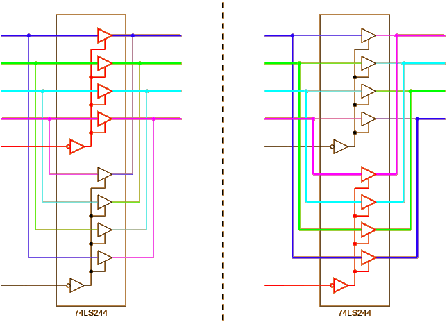 Anstelle des 74LS244 kann man zum deutlich besser verfügbaren 74HCT244 greifen (was ich auch getan habe). Ich habe in diesem Diagramm absichtlich auch die inaktiven Wege farblich gekennzeichnet, um auf ein wichtiges Thema aufmerksam zu machen: hier werden Logik-Ausgänge miteinander verbunden. Das ist normalerweise ein elektrotechnisches Pfui-pfui, weil gegeneinander treibende Ausgänge (also einer sagt HIGH, einer sagt LOW) zur Zerstörung der Bauteile führen können. In diesem Szenario ist das aber okay, wenn konstruktiv ausgeschlossen wird, dass beide Ausgänge gleichzeitig treiben.