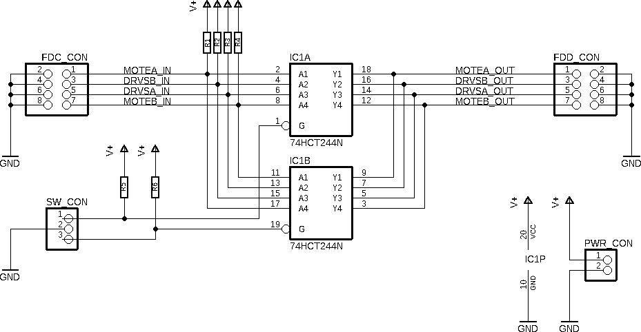 Zur Umsetzung kamen als erstes Relais in den Sinn, aber das wären vier Stück gewesen, die noch dazu im angezogenen Zustand ca. 250 mW an Verlustleistung produzieren. Das wirkte irgendwie recht unelegant. Bei genauerem Hinsehen hat sich gezeigt, dass die umzuschaltenden Signale unidirektional sind, nämlich nur vom Floppy-Controller ausgehend an die Laufwerke. Somit ergibt sich auch die Möglichkeit einen Buffer bzw. Line Driver wie den 74LS244 zu verwenden. Gerade der 74LS244 hat sogar die praktische Eigenschaft, 2 x 4 Leitungen schalten zu können, mit separaten Output-Enable-Leitungen. Die resultierende Schaltung sieht logisch betrachtet ungefähr so aus: