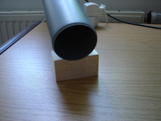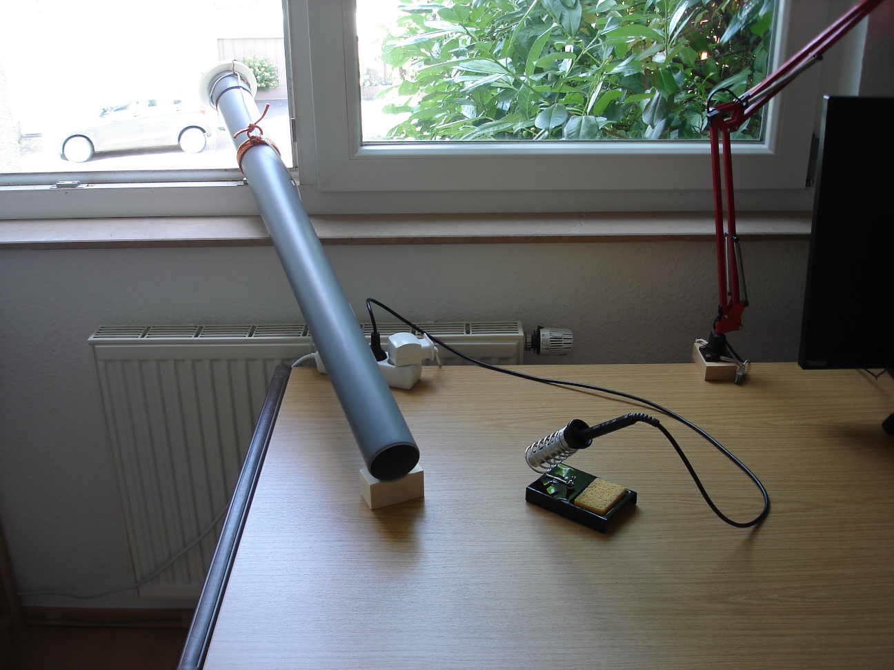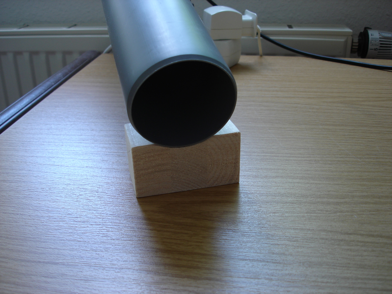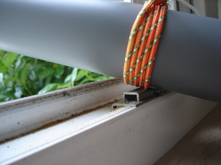 Damit ist der eigentliche Aufbau fertig. Je nach Einsatzort möchte man aber vielleicht noch ein paar Holzklötze zurecht sägen, die man unterlegen kann, damit das Rohr nicht wegrollt. In meinem Fall habe ich auch noch eine kräftige Allzweckschnur ein paar mal um das Rohr gewickelt und verknotet; das Ganze lässt sich stufenlos verschieben und bietet in Verbindung mit einem Beschlag am Fensterrahmen eine halbwegs stabile Lagerung. Ein Holzklotz am unteren Ende ermöglicht dann die genaue Positionierung des Rohrendes.