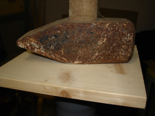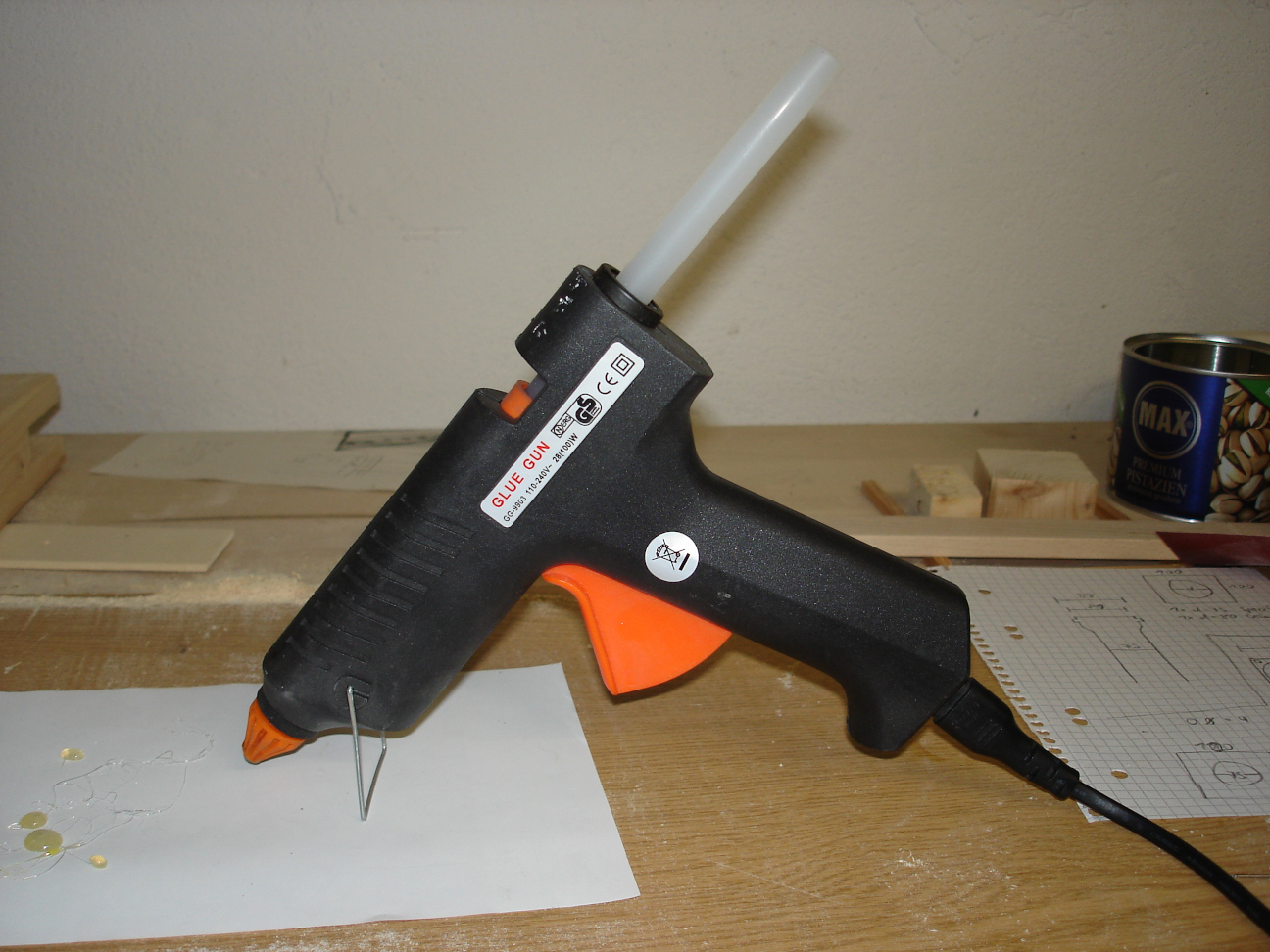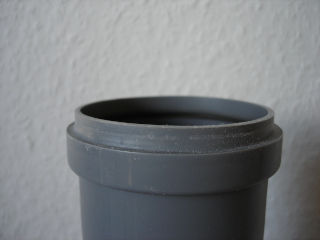 Danach wird die Kappe auf das HT-Rohr geklebt. Dazu habe ich den Heißkleber als Wurst auf den Rand aufgetragen und die Kappe aufgesetzt. Das hat so mittelprächtig geklappt, es ist eine kleine Lücke entstanden. Vielleicht wäre es hier besser gewesen, einen Flüssigkleber (Uhu, Pattex) oder ebenfalls Holzleim zu verwenden (keine Ahnung ob der auf Polypropylen hält). Ich habe das Ganze mit einem Vorschlaghammer beschwert, damit während des Trocknens etwas Anpressdruck vorhanden ist.