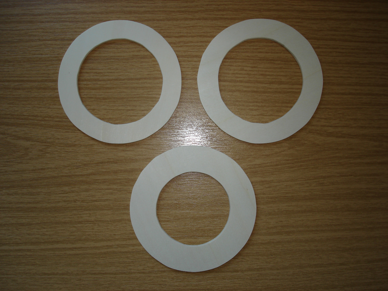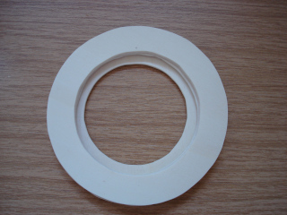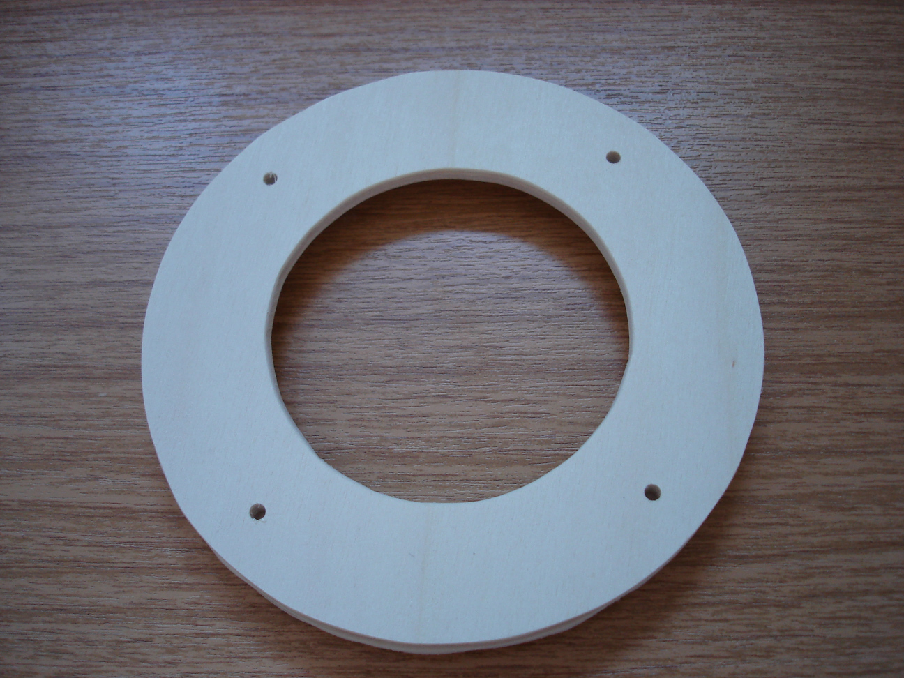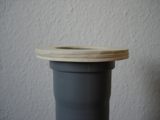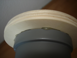 Zunächst sägt man aus dem Sperrholz drei Ringe aus, Außendurchmesser 120 mm, Innendurchmesser zwei mal 80 mm und ein mal 75 mm. Diese Ringe werden aufeinander geleimt, sodass der Ring mit der kleineren Öffnung auf einer Außenseite liegt. Dies wird eine Kappe, die auf das Ende des HT-Rohrs passt und eine Plattform für den Gehäuselüfter bildet.