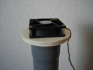 Anfangs war ich etwas unsicher, wierum ich die Luft durch das Rohr leiten sollte. Entweder der Lüfter saugt aus der Umgebung an und schiebt die Luft durch das Rohr, oder er sitzt am fernen Ende des Rohrs und saugt die Luft hindurch. Eigentlich war die Wahl, die Luft durch das Rohr zu saugen, dann doch ziemlich naheliegend: