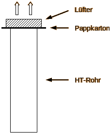 Der Pappdeckel dient der Befestigung des Lüfters am HT-Rohr (siehe Zeichnung). Den Lüfter selbst bekommt man kaum ordentlich dicht an das Rohr angesetzt. Dafür ließ sich die Pappe leicht und dicht befestigen, indem man zwei Seiten umklappt (vorher mit einem Messer auf der späteren Oberseite anritzen) und diese mit Klebeband befestigt. Vorher aus dem Karton eine Scheibe ausschneiden, die in etwa dem Durchmesser des Rohrs entspricht. Den Lüfter kann man daraufhin recht leicht befestigen, indem man kleine Löcher in die Pappe sticht, die den Schraublöchern des Lüfters entsprechen. Hier kommt der Blumendraht ins Spiel: jeweils durch Lüfterloch und Pappe runter und durch das nächste Loch wieder rauf. Am Ende festdrehen und eventuelle Lücken mit Klebeband abdichten.