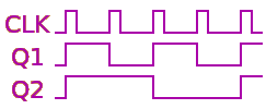 Wechsel von 0 auf 1 im ersten Flip-Flop führt zu einem Wechsel von 1 auf 0 im zweiten Flip-Flop.