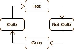 Viele Aufgaben aus dem Bereich Steuerung und Regelung lassen sich durch Zustandsautomaten lösen. Ein Zustandsautomat besteht aus einer Menge von Zuständen sowie Bedingungen unter denen die Zustände gewechselt werden. Eine sehr primitive Unterart der Zustandsautomaten sind zeitlich getaktete Sequenzen, also Folgen von Zuständen die in immer gleicher Reihenfolge eingenommen werden und deren Wechsel durch einen regelmäßigen Takt ausgelöst wird. Ein schönes Beispiel ist eine Ampel-Steuerung, bei der die einzelnen Zustände definieren, welche der verfügbaren Lampen jeweils leuchten. In Form eines Zustandsdiagramms sähe das so aus: