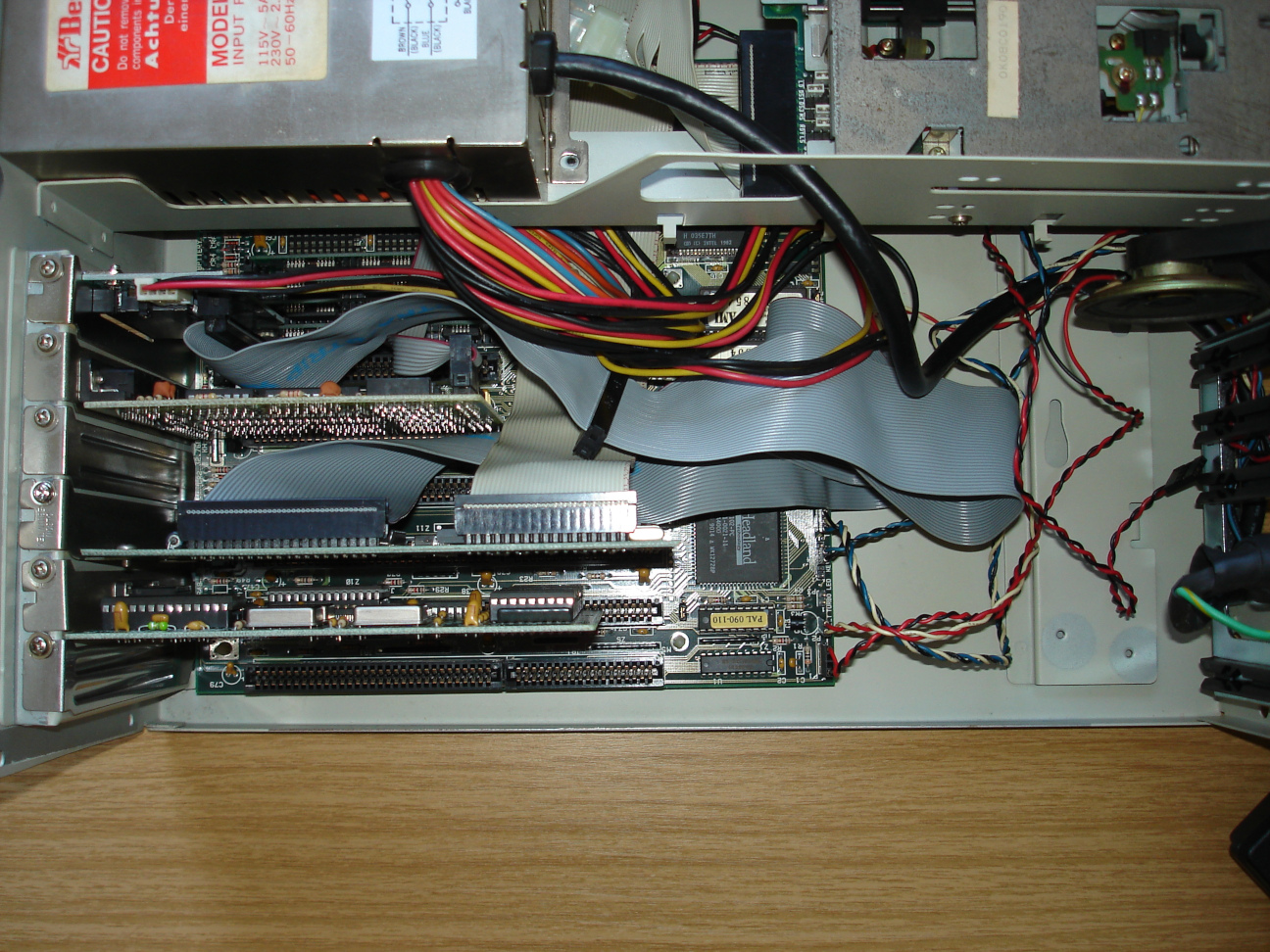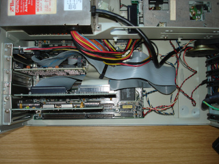 Das Einzige, das mich jetzt noch etwas stört, ist das ewig lange IDE-Kabel, das eigentlich nur bis zur übernächsten Steckkarte reichen müsste. Vielleicht bastel ich mir da bei Gelegenheit ein Kürzeres. Funktionieren müsste das ja, es gibt schließlich auch CF-Lösungen die man direkt auf den Wannenstecker eines IDE-Controllers stecken kann (so von wegen Kabellänge, Signallaufzeit, usw.).
